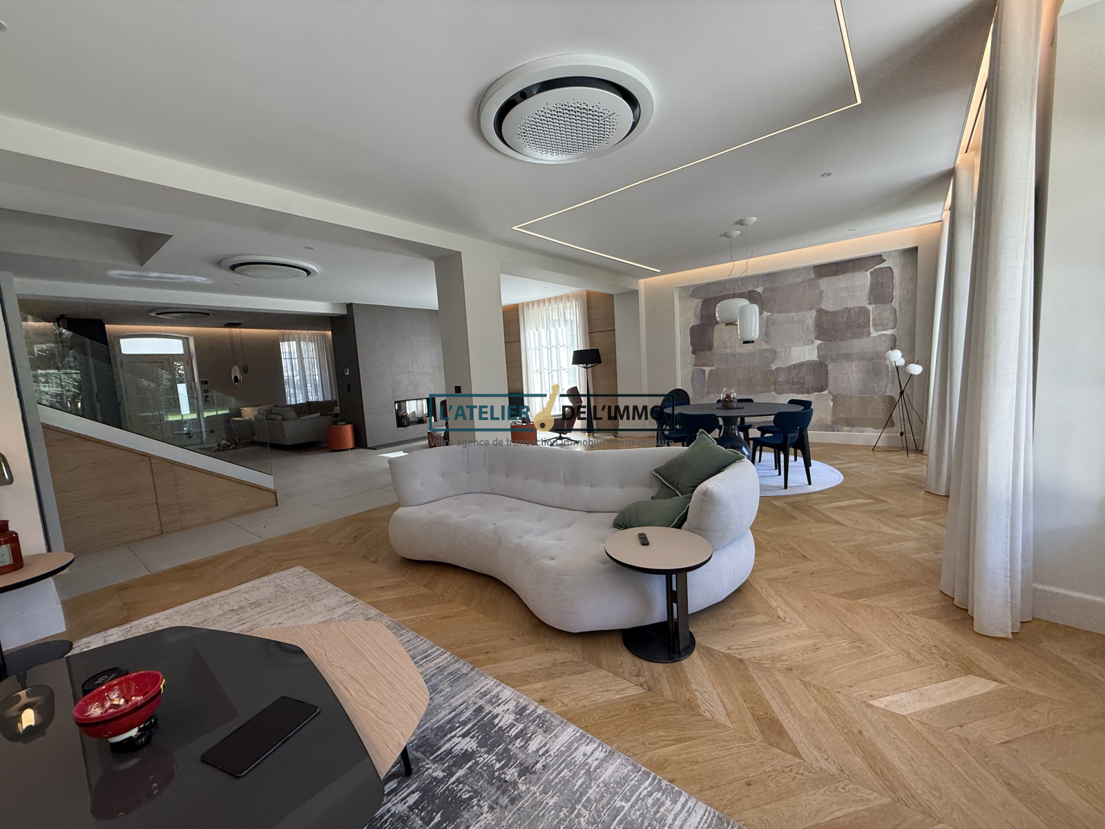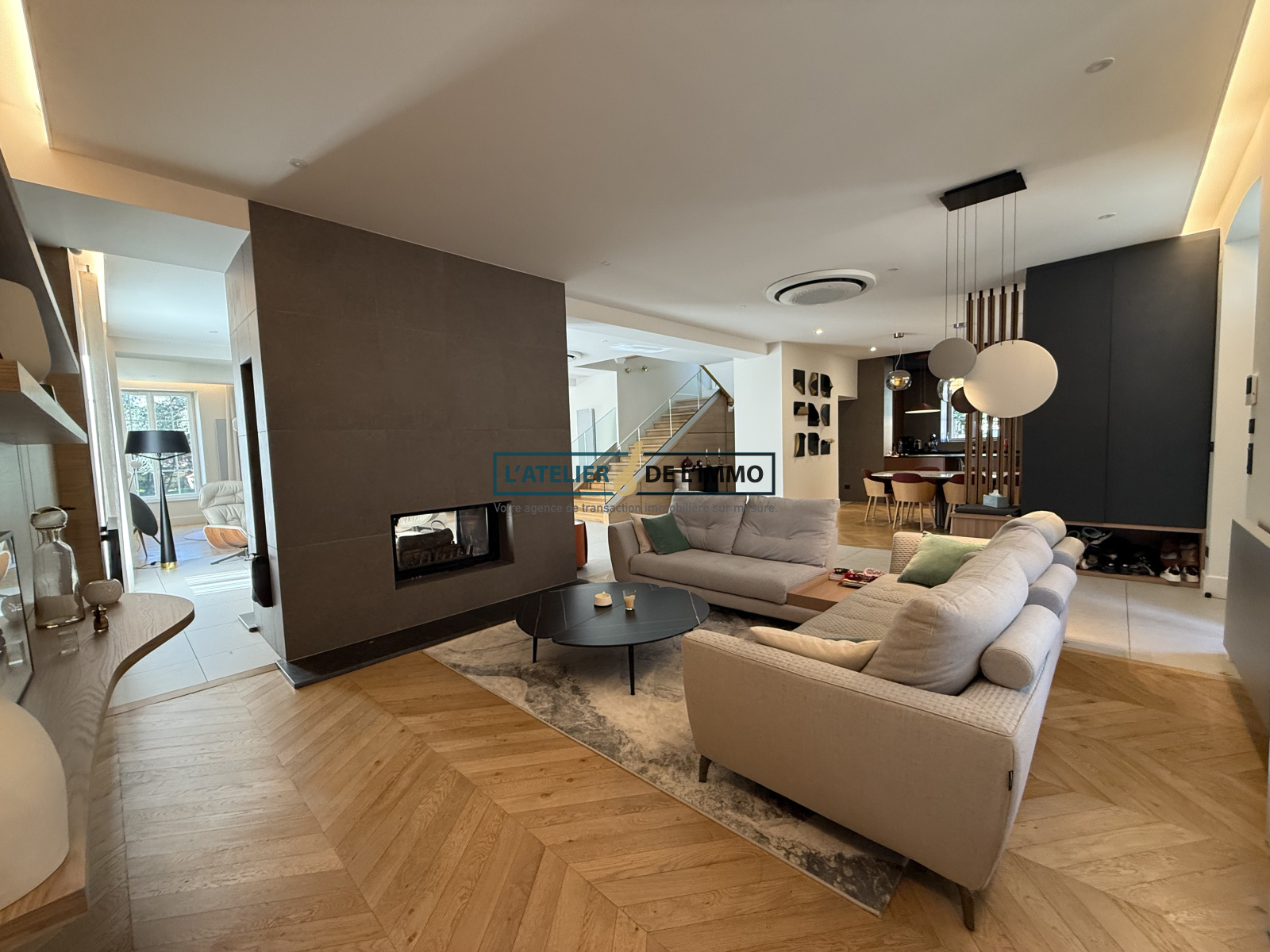Dès l'entrée, la magie opère grâce à une pièce de réception magistrale de plus de 110 m². Baignée d'une lumière naturelle exceptionnelle grâce à ses immenses baies vitrées ouvertes sur l'extérieur, elle offre une circulation fluide entre un vaste salon aux lignes épurées, une salle à manger chaleureuse, un espace lecture et détente intimiste.